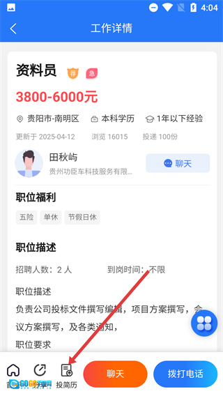 在【资料员】职位的工作详情页面,浏览完职位福利的描述等相关信息后,点击页面底部的【投简历】按钮,即可进入简历投递的相关页面。