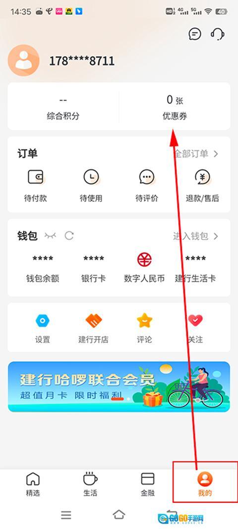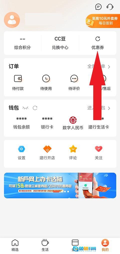 用户打开建行生活应用,点击“我的”进入个人中心页面,随后点击页面上方的优惠券选项。