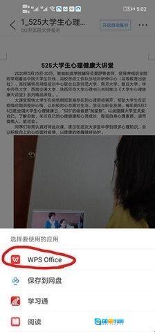 当选择用其他应用打开文件时,系统会弹出应用选择界面,此时需从中选择WPS Office(该操作需要使用手机版WPS,若手机中未安装,可在应用商店搜索下载)。
