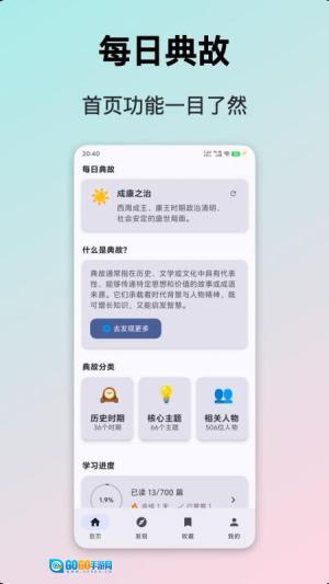 1、该应用每日推送一则精选典故,帮助用户日积月累地汲取国学智慧,其分类系统极为智能,能够按照历史朝代。
