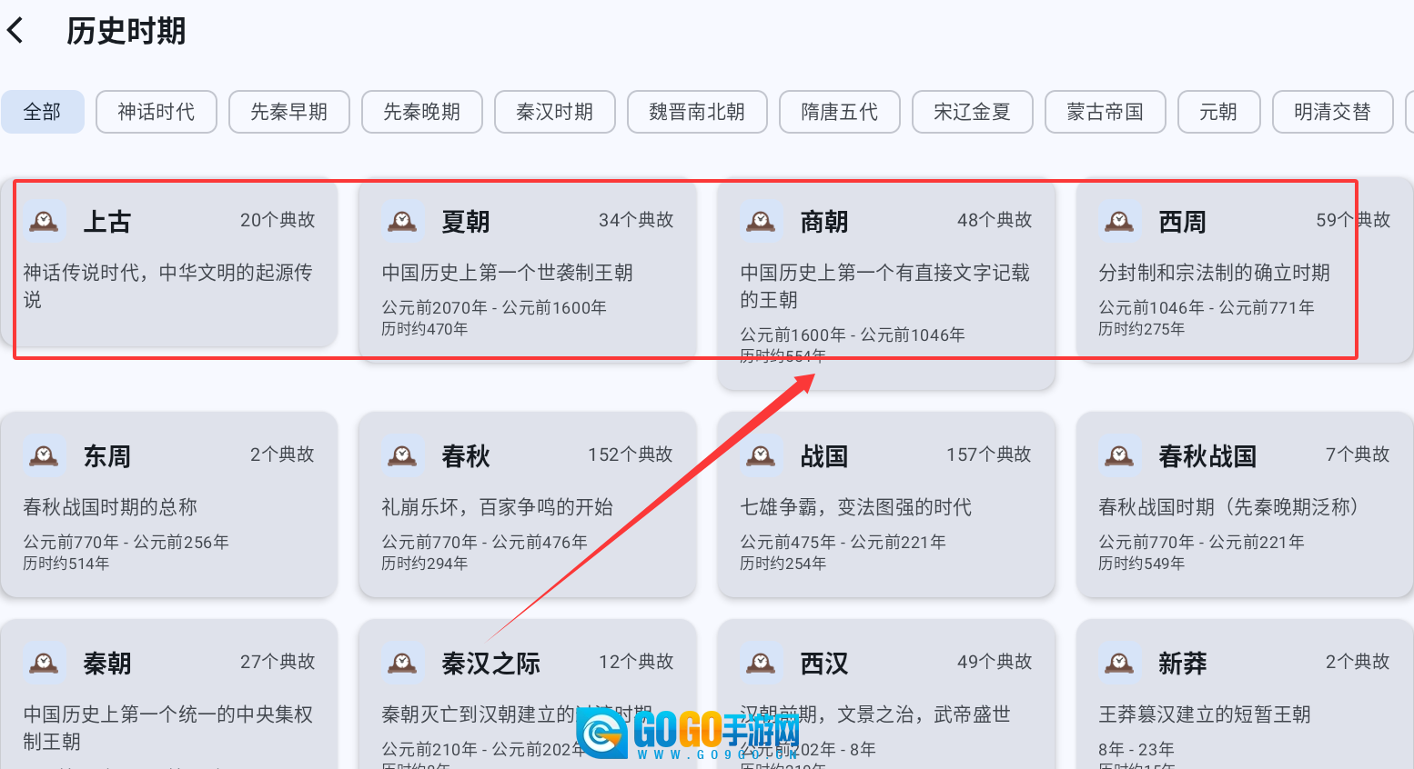 你可以在历史时期板块进行选择,从远古到明清,每个时期包含多少典故都标注得十分清晰,点击进入就能查看浏览。
