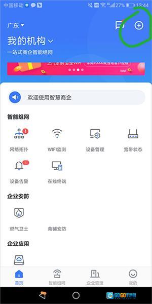 登录智慧商企平台后,进入首页,找到右上角那个带有+号的小圆圈图标(即下图中绿色圈圈标注的区域)并点击它。