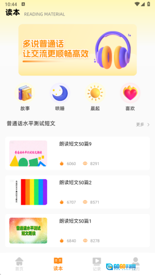 场景素材库包含晨读故事、睡前美文等音频资源,用户可以边听边跟读,同时还能同步查看对应的普通话测试原文内容。