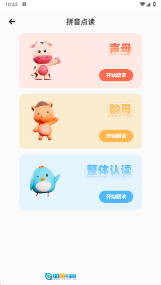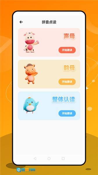 在拼音点读功能模块里,你可以挑选韵母或者声母,只要点击屏幕就能听到标准的发音,还能跟着朗读,系统会对音调进行对比分析。