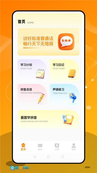 首页设有学习计划、学习日记、拼音点读、声调练习、看图学拼音等板块。