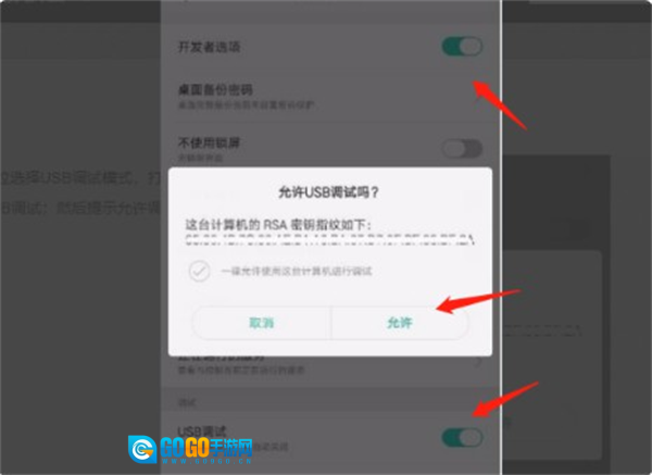 在弹出的界面里,把开发者选项和USB调试的开关开启,并且按照提示点击允许USB调试就可以了。