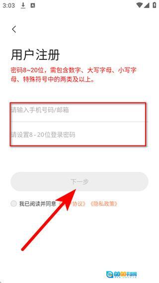 3、进入用户注册页面后,填写拟注册的手机号码或邮箱,设置好密码,接着点击下一步按钮。