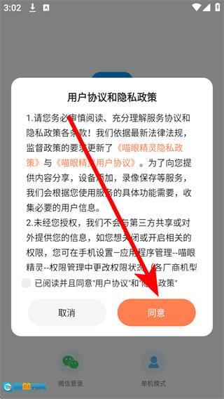 1、启动喵眼精灵应用,待弹出相关弹窗后,勾选协议对应的选项并点击同意按钮,随后进入登录界面。