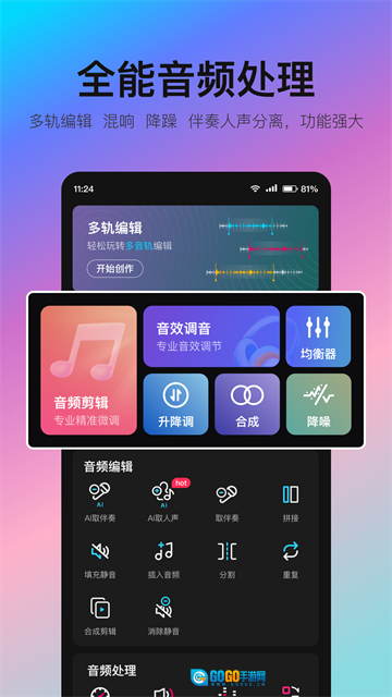 1、【多轨编辑】:支持同时对多个音轨进行编辑操作,可完成对齐、分割、调整及添加音效等任务,具备强大的混音功能