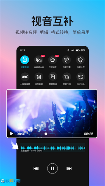 2.AI智能提取:借助AI技术一键分离音乐中的伴奏与人声,提取出的音频纯净无杂音,还支持钢琴、鼓点等乐器的专项提取。