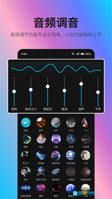 4、【添加音效】:给音频添加各类音效,比如和声、混响、高低音调节、黑胶唱片质感、音乐厅空间感、录音棚纯净音质等效果