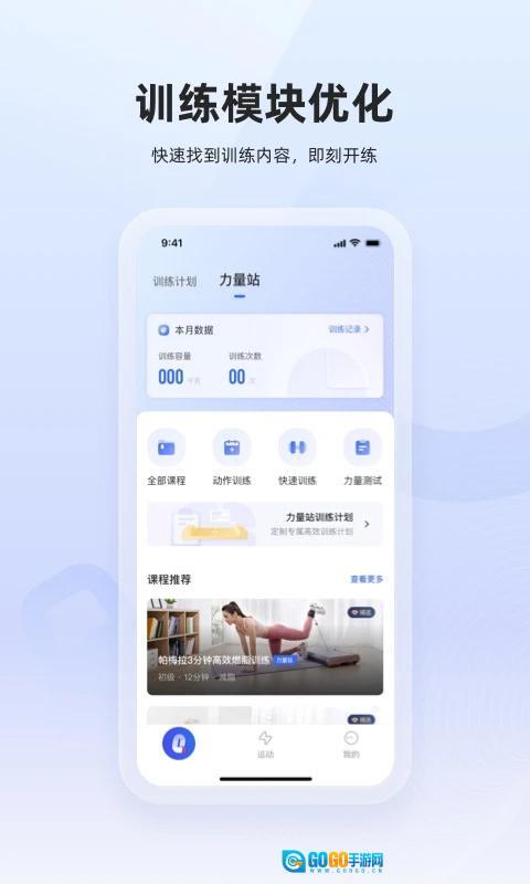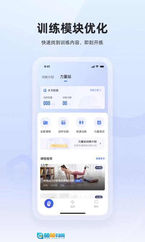3.优质精品课程库:提供由专业教练团队设计的力量训练、塑形课程(如胸部塑造、全身燃脂),课程包含动作分解、语音指导及阻力调控,支持用户自由组合课程模块。