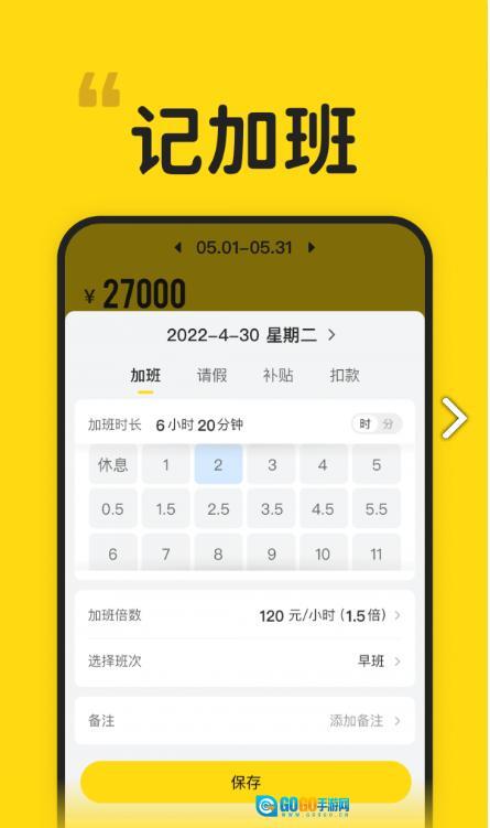 2.支持批量记加班,一次可记多天,用起来更方面