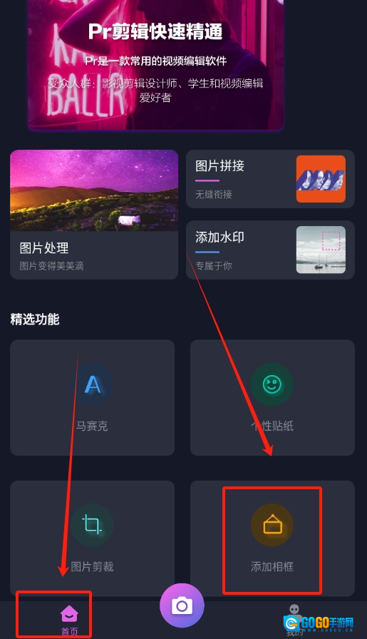 1、启动水印滤镜相机应用,在首页找到“加相框”功能入口,点击后进入相框挑选页面。