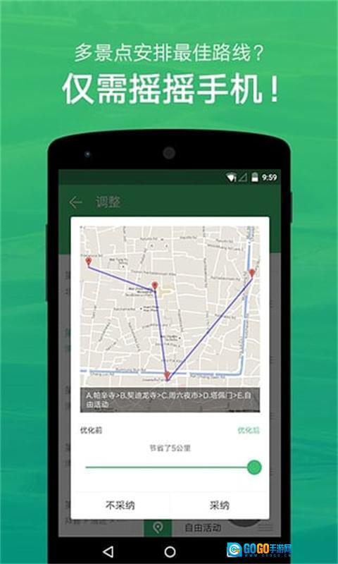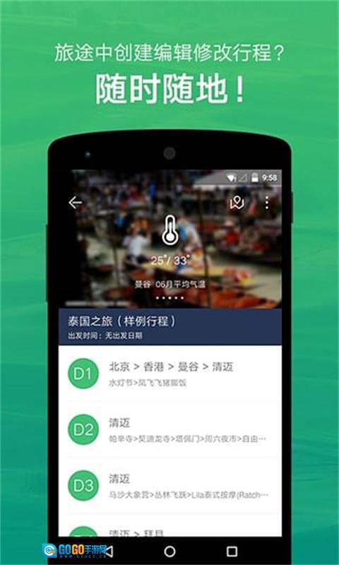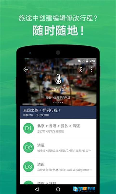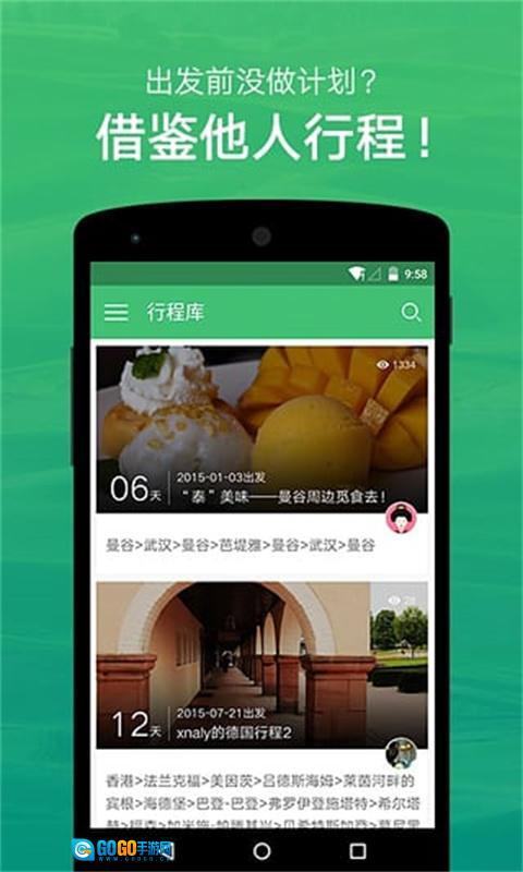 1、海量行程数据,精选优质路线 覆盖全球200多个国家与10000多座城市,数百万条境内外行程任你随心搜索、直接复制。懒癌发作或工作繁忙都不是阻碍,旅行本该说走就走!