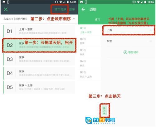 2、想要插入某一天行程的话,长按之后进入编辑状态,并且上方出现“城市调序”。