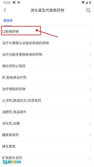 3、在消化道及代谢类药物的列表页面,点击口腔病药物这一选项,即可进入口腔病药物的分类页面。