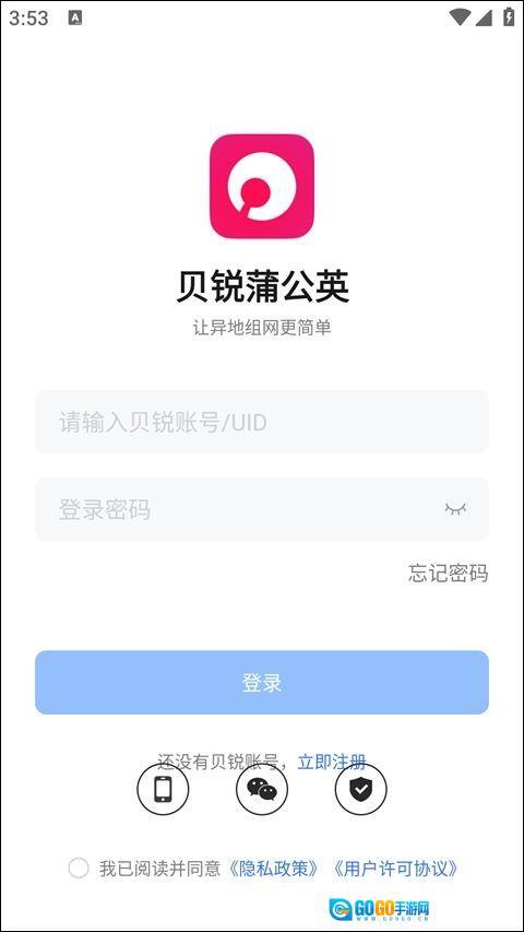 1、打开贝锐蒲公英软件后,需先完成登录操作方可使用,该软件支持多种登录渠道供用户选择。