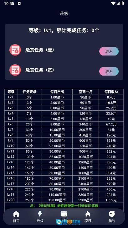 在升级页面完成10个悬赏任务后,系统会自动将等级提升至Lv5;此外,每日签到可获得5.00星币。