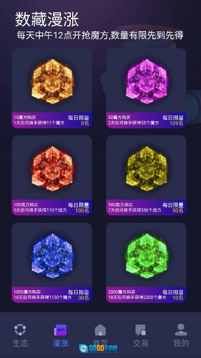 首发推出99元白银卡、299元白金卡与599元黄金卡,每日分别产出2/8/18个魔方每天中午12点抢魔方存入名额,漫涨玩法