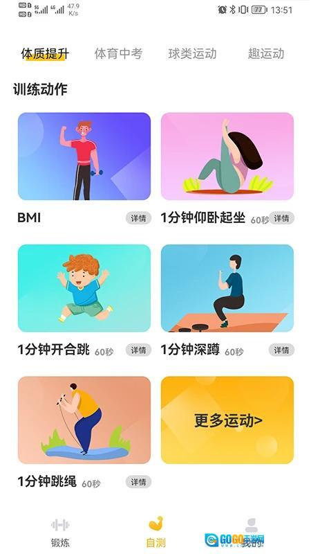 1.多元运动项目集成:覆盖跳绳、仰卧起坐、引体向上、中长跑、足球、篮球等中小学体育考核项目,满足家庭锻炼与学校体测双重需求。例如,用户可在“趣运动”模块体验“30秒跳绳挑战”“篮球运球接力”等游戏化训练。