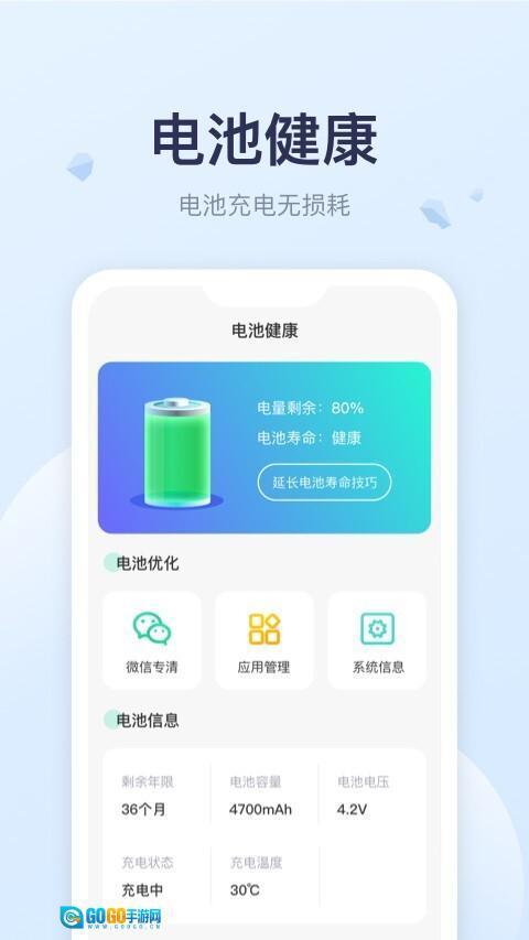 2.电池健康检测:实时检测电池健康状态,包括剩余年限、电池容量、电池电压等信息,并给出优化建议,让用户随时掌握电池状况。
