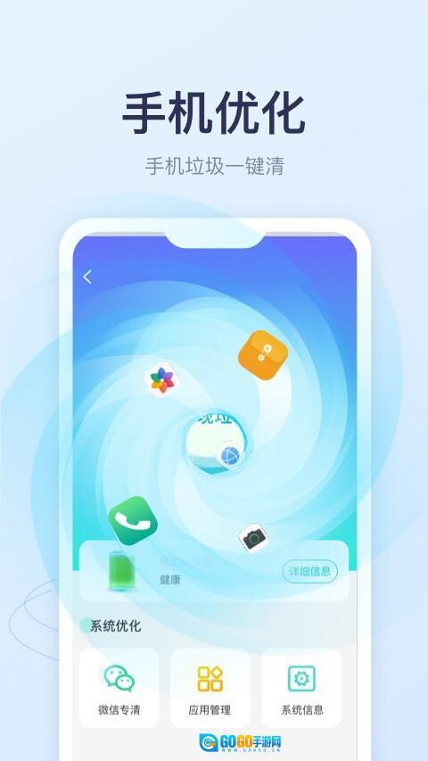 4.系统优化工具:支持微信专清、应用管理、垃圾清理等功能,全面清理手机冗余文件,提升手机运行速度。