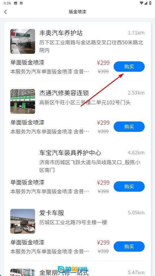 2、进入钣金喷漆页面后,挑选好合适的门店,接着点击【购买】功能按钮,就能进入商品详情页。