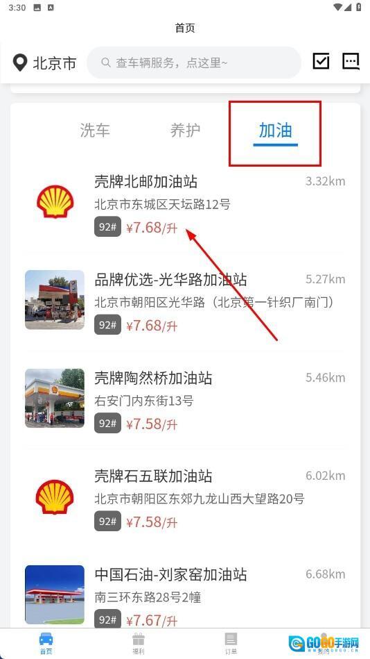 4、点击【加油-分类标签】,能够查看周边的加油站以及油价信息,进而挑选合适的加油站开展加油相关的操作。