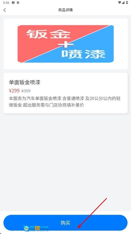 3、进入商品详情页面后,能够查看钣金喷漆服务的具体信息,点击【购买】功能按钮即可完成购买操作。