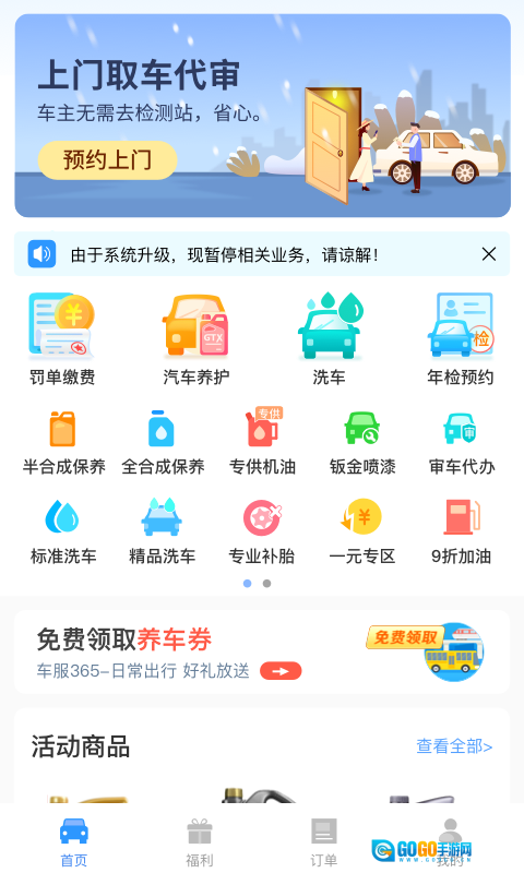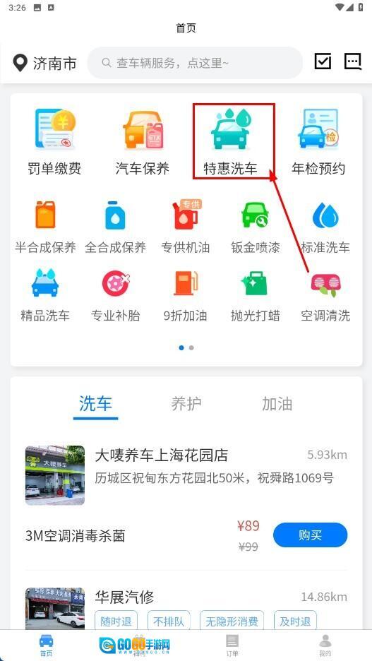 1、点击【特惠洗车】功能按钮,既能进入对应的服务页面,也可以选择使用其他汽车服务功能。