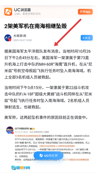 4、进入新闻详情页面后,可查看类似【2架美军机在南海相继坠毁】这样的详细报道,以知晓事件的具体情况。