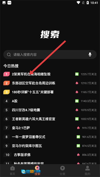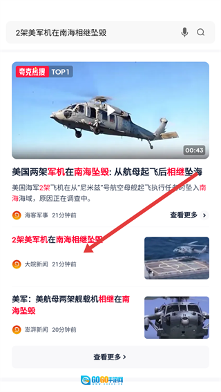 在搜索页面里,点击今日热搜里的相关条目,比如【2架美军机在南海相继坠毁】,就能进入到搜索结果页面。