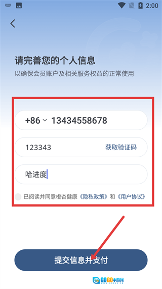 4、进入个人信息填写页面后,依次填写手机号、验证码、姓名等相关信息,随后点击【提交信息并支付】按钮,即可完成入会申请与支付的全部流程。