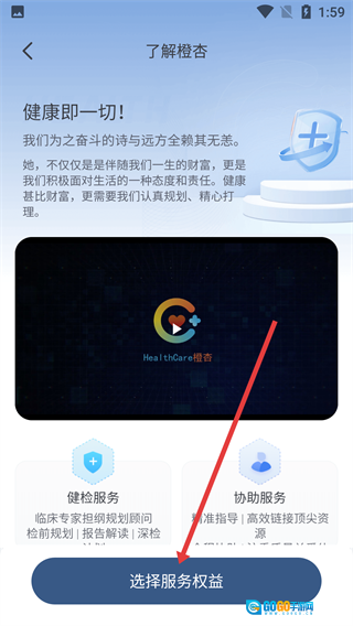 2、进入橙杏了解页面后,点击【选择服务权益】按钮,即可进入服务权益说明页面,查看各类会籍权益的详细内容。