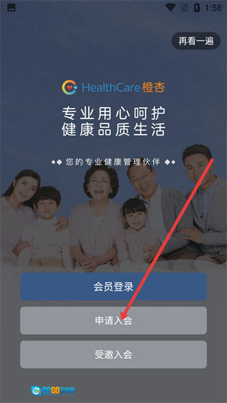 1、在橙杏健康界面,点击【申请入会】按钮,即可进入橙杏健康的介绍页面,正式启动入会流程。