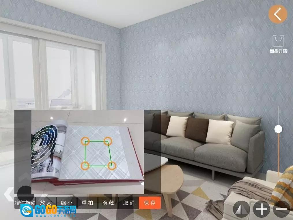 在导入墙纸样本实拍图片后,需要用4个橙色的圆圈来做4点定位,标识出最少一个完整花型。在做4点定位时,会出现放大镜辅助工具,让定位更清晰更精准。随着四个定位点的挪动,底层墙面上会自动地循环铺贴这四个点所框选出的花型,展示满屋铺贴的效果。预览满铺的实时变化,再快速微调四个点的定位,很快就能生成一个理想的墙纸单元图。随后用“放大”、“缩小”来控制花距。经过“保存”以后,可以在“我的拍照”文件夹中找到和重新使用。