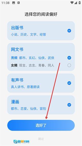 选择好阅读偏好后,点击【选好了】按钮,即可进入书城页面。