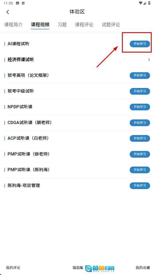 3、挑选自己感兴趣的课程,比如AI课程的试听,然后点击【开始学习】这个功能按钮。