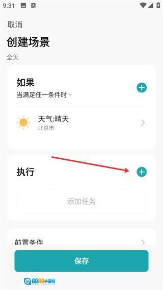 3、在场景配置界面中设置“如果”对应的触发条件(例如天气为晴天),接着点击“执行”区域的“+”按钮来添加具体任务。