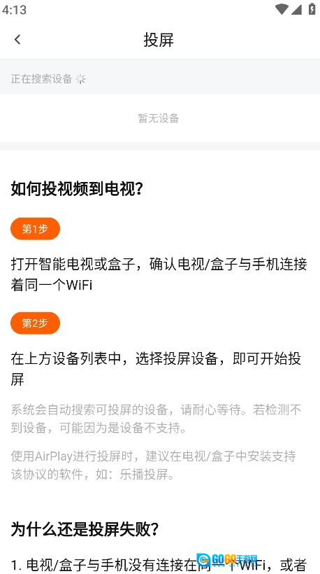 3. 打开电视,确认手机与电视连接着同一个WiFi,接着点击对应的投屏设备,就能启动投屏了。