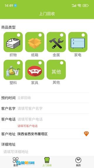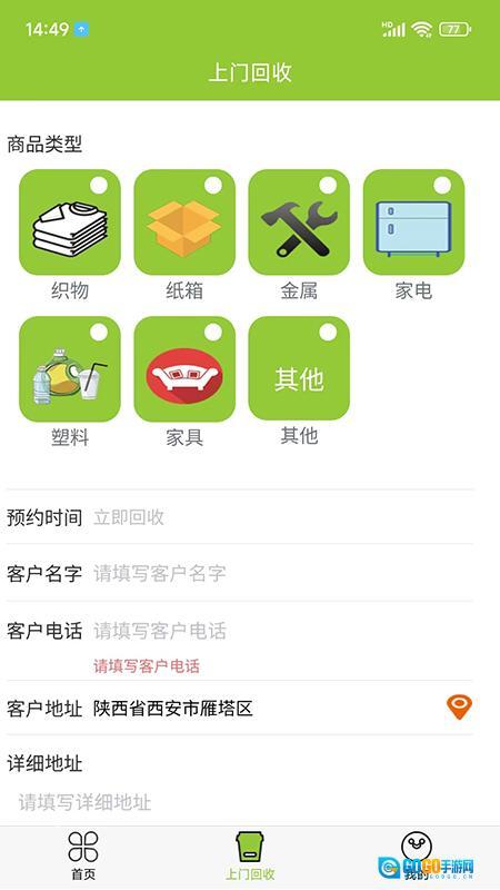 3、上门回收页面设有商品类型选项,用户可在此预约回收时间并填写详细信息。