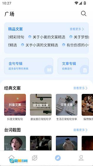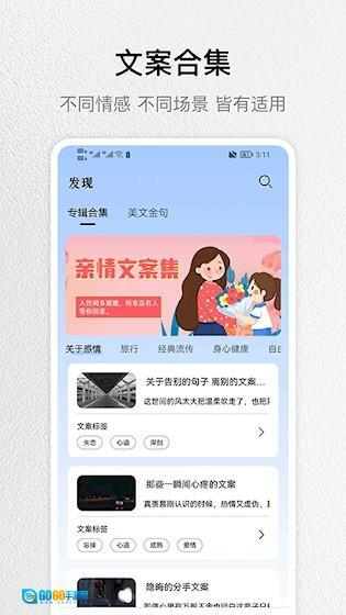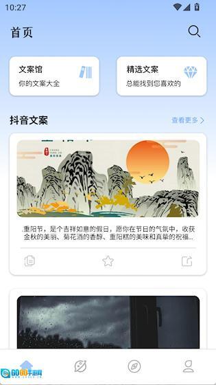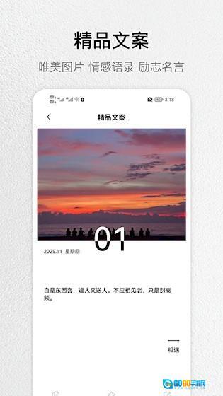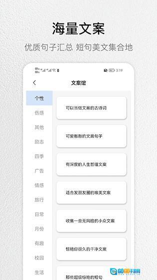 1、内容丰富多元:平台汇聚了海量文案资源,涵盖励志语录、情话短句、节日贺词等多种类型,覆盖日常生活的诸多场景,能够满足用户不同情境下的表达需求。