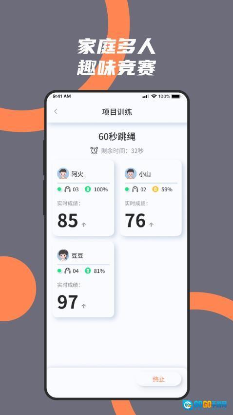 家庭多人实时智能跳绳同练。 个人跳绳多种训练模式。