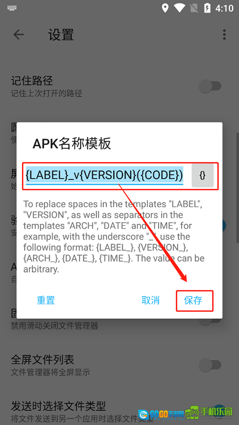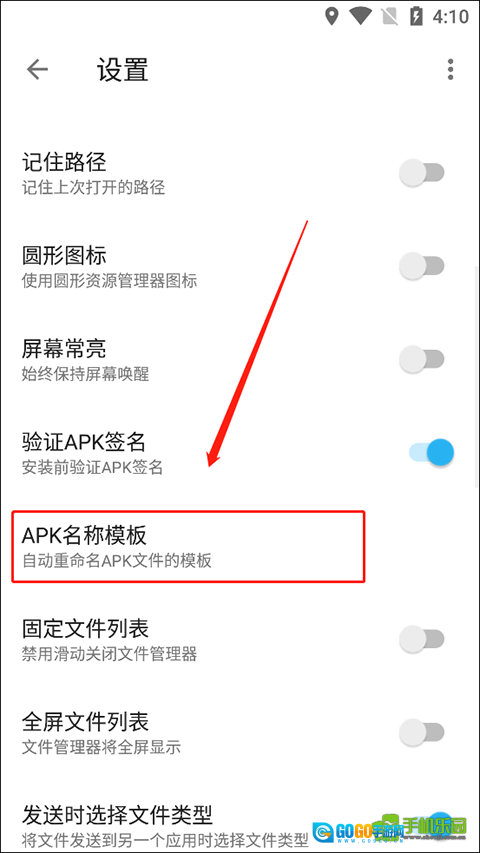 3.修改APK名称模板:在应用设置界面里,找到“APK名称模板”这一项,点击进入即可。