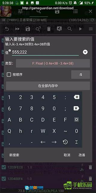 当我们需要搜索两个数据时,如果逐个搜索,数值量可能会很大,容易导致系统崩溃。这时,我们可以使用联合搜索功能。例如,若生命值为555、攻击力为222,只需在搜索面板输入“555;222”——即一个数值后加分号,再输入另一个数值,搜索面板中已提供分号输入选项。