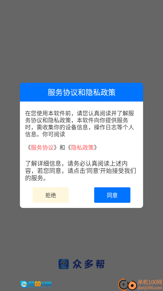 1. 启动软件后阅读“服务协议和隐私政策”,点击“同意”按钮进入下一步
