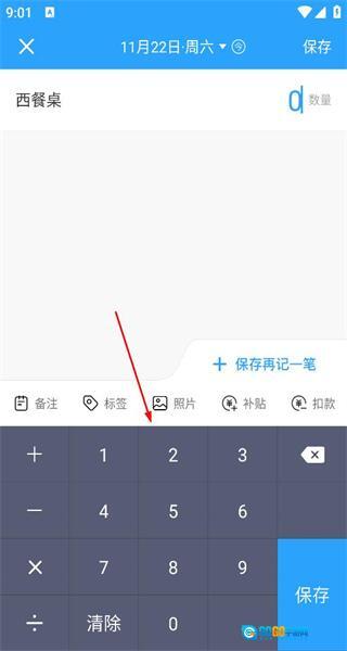 4、在数据记录界面输入“西餐桌”作为名称,通过键盘输入数量,完成该产品的记录操作后,准备进行保存。