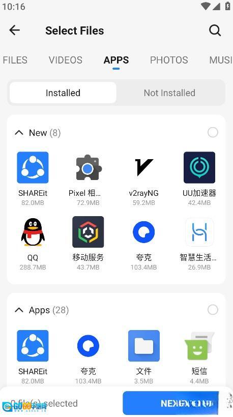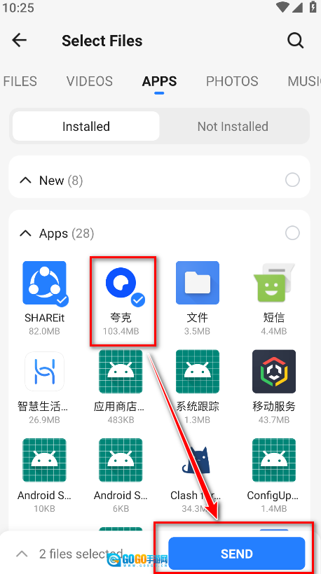 挑选你想发送的文件类型(比如图片、视频、应用程序之类的),然后勾选对应的具体内容。