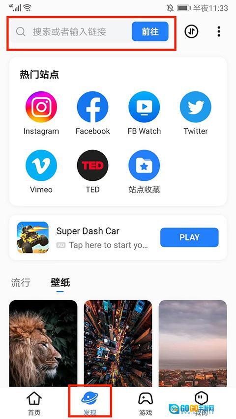 5、在发现页面,有热门站点和精选壁纸推荐,用户可通过左上方的搜索框进行搜索,也能输入链接访问。